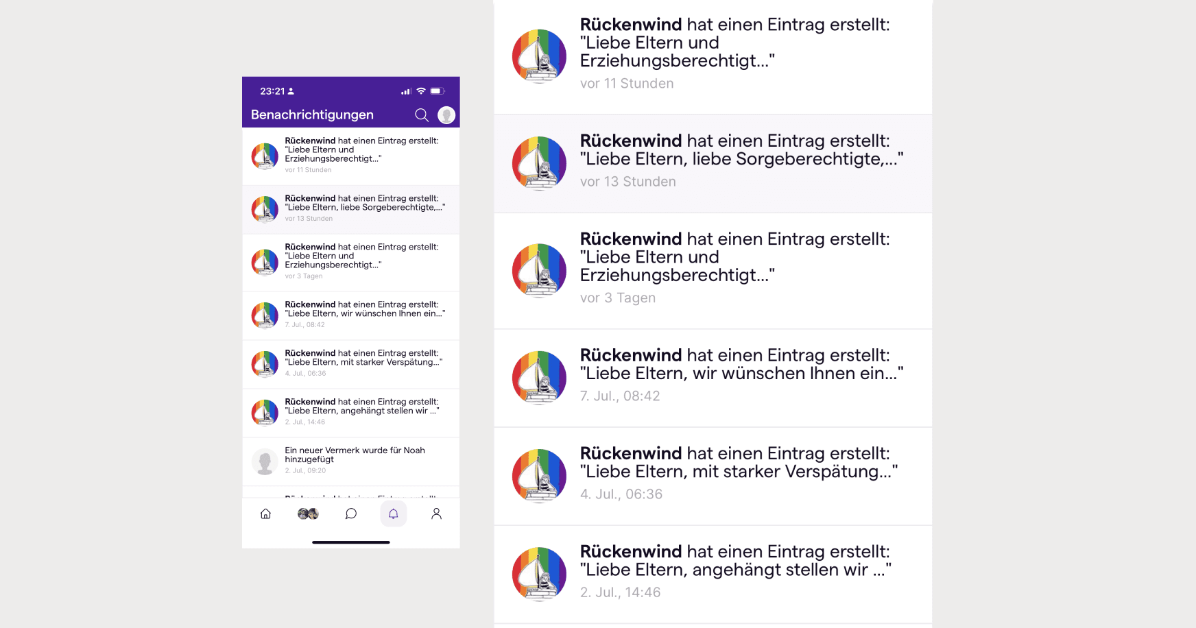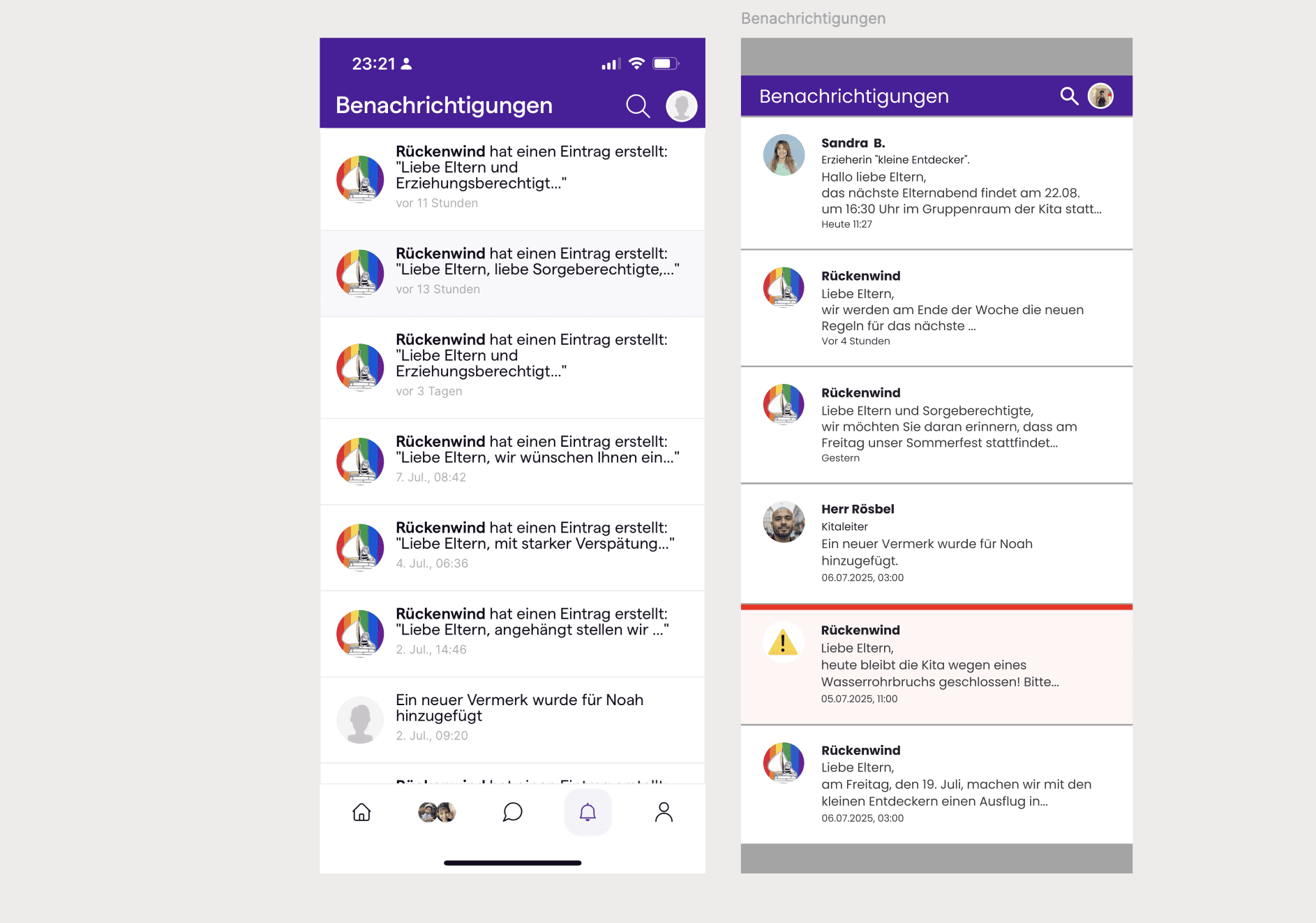 Im bestehenden Design der App wirken alle Nachrichten optisch gleich, unabhängig davon, ob sie persönlich, informativ oder dringend sind. Dadurch wird es für Eltern schwierig, die Relevanz und Dringlichkeit einer Nachricht auf den ersten Blick zu erkennen.