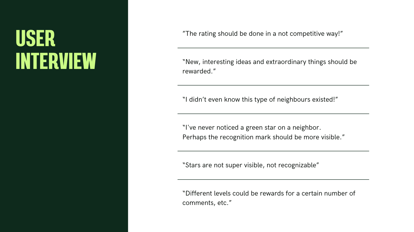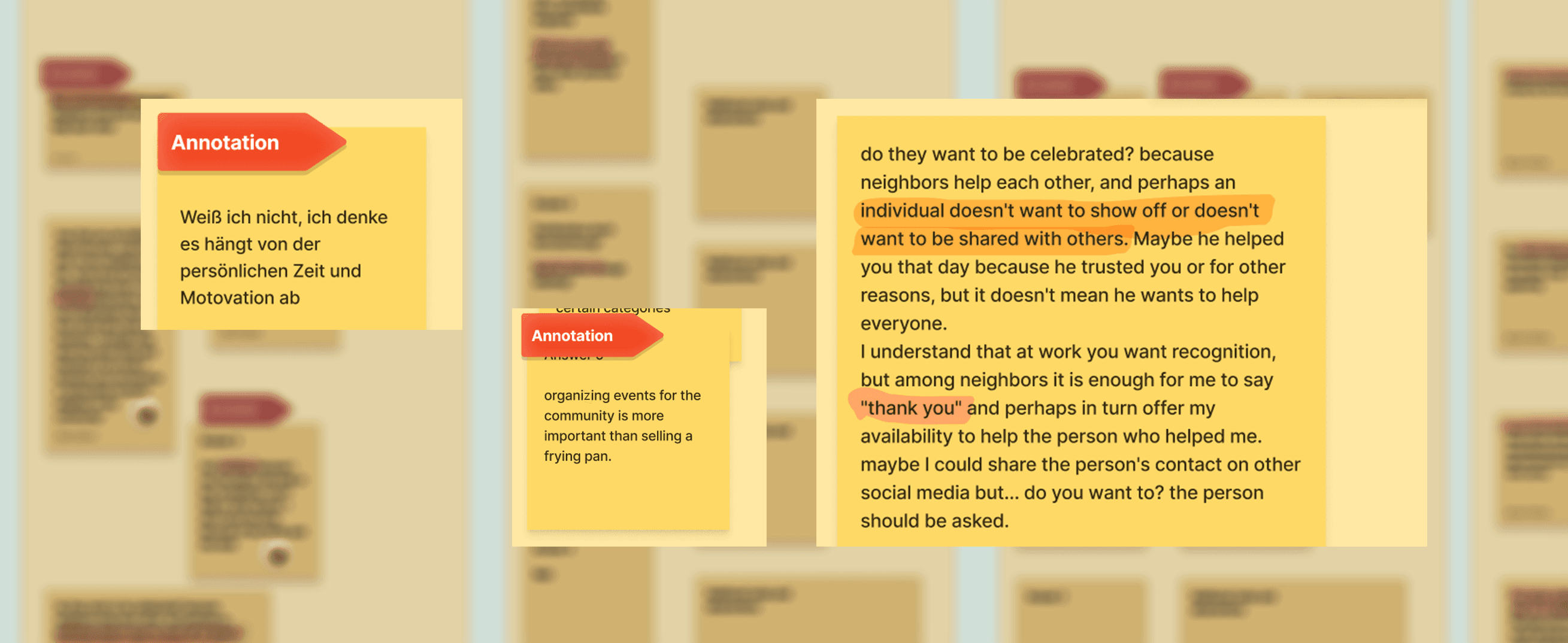 Viele Teilnehmer:innen fanden, dass besonders engagierte Nachbar:innen eine Art Anerkennung erhalten sollten – zum Beispiel als "Bester Nachbar" –, solange dies nicht wettbewerbsorientiert oder zu auffällig umgesetzt wird.